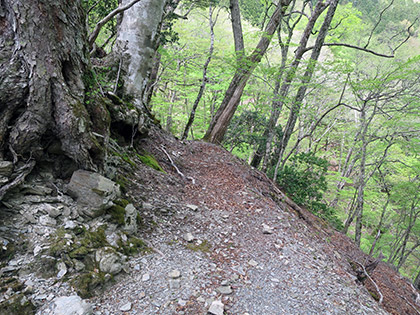 歩き始めてすぐ。ボンヤリしてまっすぐ行ってしまうと、崩落跡を谷まで滑り落ちてしまします。ここで慎重に右に折れます。