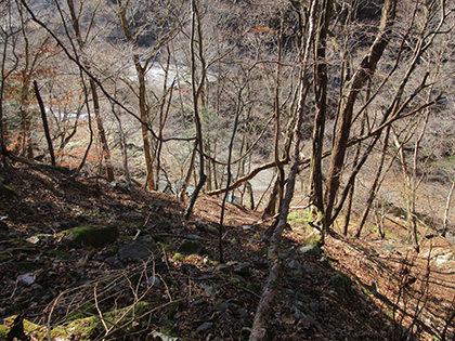あまりの傾斜にチェーンスパイクはグニュッ、グニヨッて靴底からずれてしまいます。直すのがメンドーなのでここでチェーンスパイクはお役御免。斜面で脚を踏ん張りながらザックにチェーンスパイクをしまっていると小川谷の音がしているのに気がつきました。