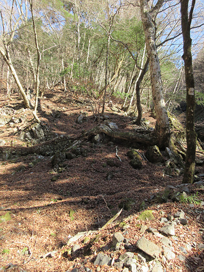 滝入ノ峰西尾根の上部は滝入ノ峰北西尾根と重なっています。とんでもない急登だったので当然とんでもない急降下です。1240m圏で微妙な分岐を左へ。