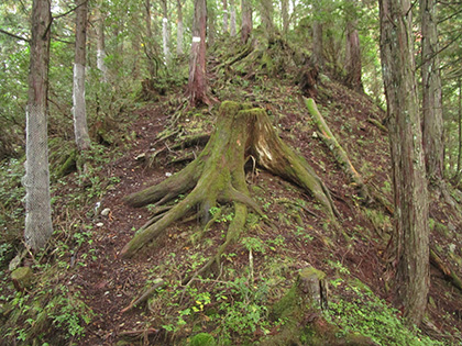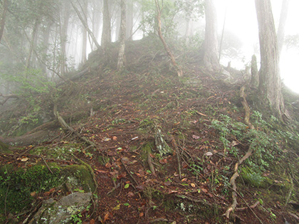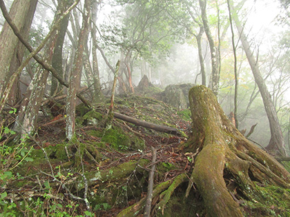 巻いた岩のてっぺんです。カタツムリの頭みたいです。あそこまで登ろうかと迷いましたが、雲に覆われてなにも見えないに違いない、なにより濡れた根っこが怖い、ということでてっぺんには登らずに尾根歩きを続行。濡れた根っこは足を置く前に滑るくらい滑りまります。とても怖いです。