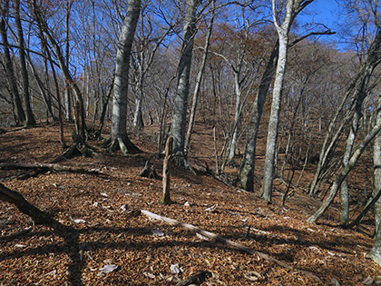 四間小屋窪左岸尾根を登ります。こんな雰囲気の尾根がしばらく続きます。勾配もほとんど変化しません。