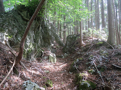 ほぼ直進する尾根を進みたいところですが、左に急降下します。こちらが本筋です。