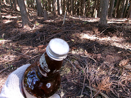 三楽オーシャンウイスキーらしき空き瓶を拾い上げました。ん? 最近どこかで同じような空き瓶を拾いました。あれは空でしたがこれは5分の1ほど入っています。下心なく、まったく下心なく何気なく蓋をねじり何気なく鼻を近づけてみると濃厚な苔のにおいがしました。びっくりしました。