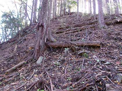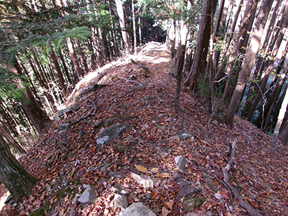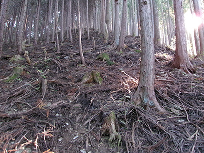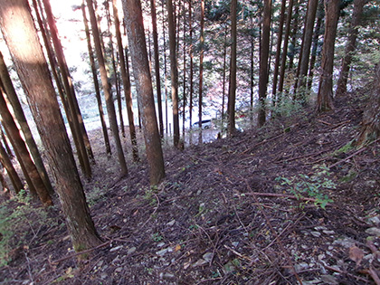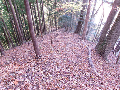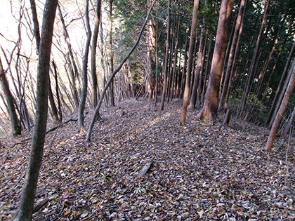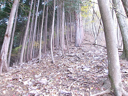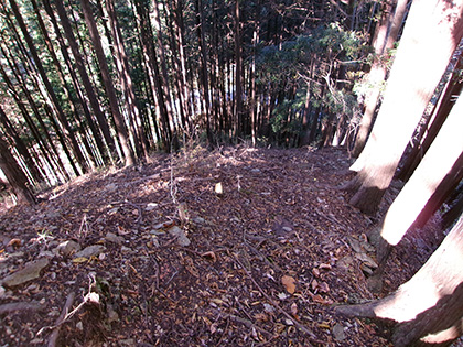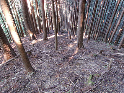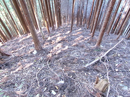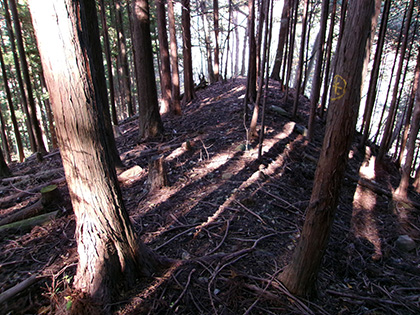 ようやく尾根の形になりました。右植林、左雑木の急降下です。