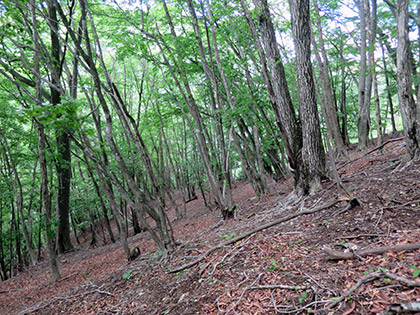 ウトウ沢右岸尾根はできるだけ下端から登ろうとしたんですが、ちょっと失敗。西隣のやたらキツい尾根を水源林巡視路(以下、巡視路)まで登って、巡視路からウトウ沢右岸尾根に取り付くことになりました。その代わりというわけではないんですが、途中から一緒になったモノレールがてっぺん近くでは尾根筋を離れていくとわたくしはモノレールと決別し、岩がちの尾根にこだわってビシッとピークまで登り詰めました。エラそーに言うほどのことではありませんが。