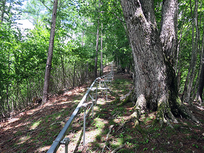 急登にあえぎながら見上げると巡視路と思われる道を確認できました。土留の材木が水平に伸びています。