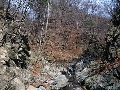 谷に降りました。上流はこんな感じ。左の岩のすき間をよじ登りました。