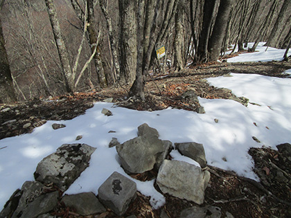 ヨコスズ尾根 ほぼ尾根上を歩きました。一杯水避難小屋手前あたりからだんだん雪が深くなってきて、小屋を越えるとズボズボ状態。トレース(踏み跡)があって助かりました。