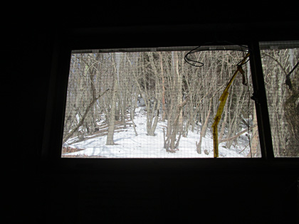 窓からヨコスズ尾根をグッと見上げ、