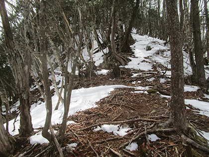 シャクナン尾根(前半 標高1260mまで) 天目山の三角点から先はトレースはなく、雪は深く、シャクナン尾根はとんでもない急登ともっととんでもない急降下で始まりました。ヤセ尾根に雪がとんがって積もっていたりもしました。