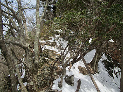 1410m圏で岩を迂回します。かなりの急降下で雪も深く、
