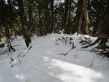 1440m圏で雪が積もっていてもはっきりわかる作業道を横切り、